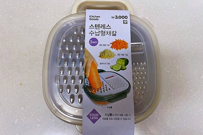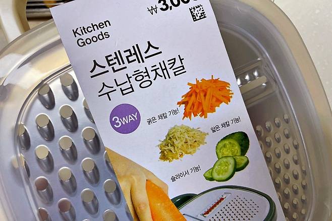 하지만 하나의 채칼에 3가지 기능이 있다는 점, 연마제가 나오지 않는다는 점, 바로 수납이 가능한 수납통이 있다는 점은 3,000원 가격에 가성비가 참 좋다고 느껴졌고 현재 잘 사용 중입니다^^(내돈내산 후기입니다)