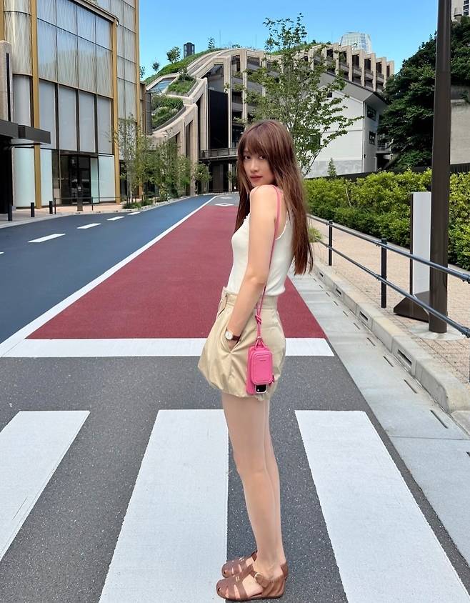 다른 컷에서는 민소매 니트에 하이웨이스트 쇼츠를 매치한 썸머룩도 인상적이었어요.