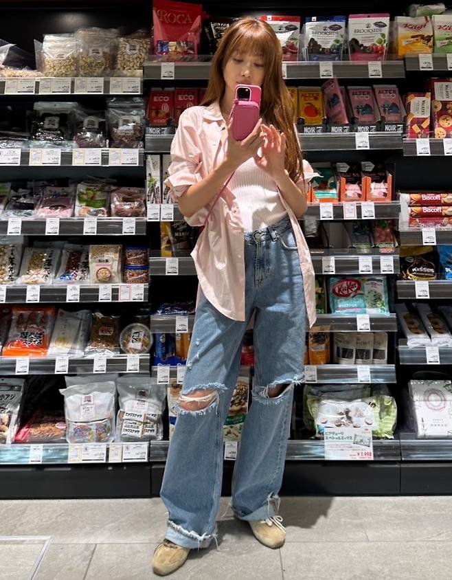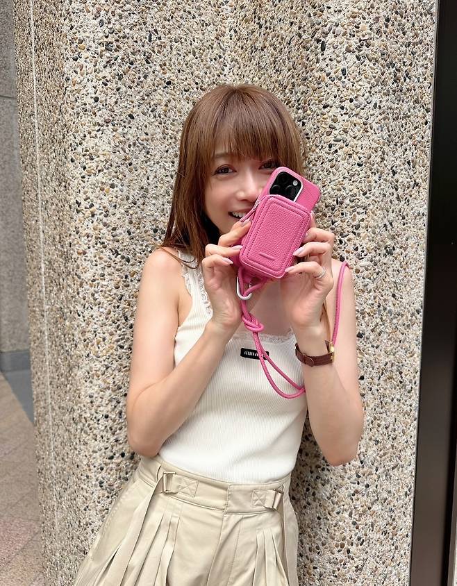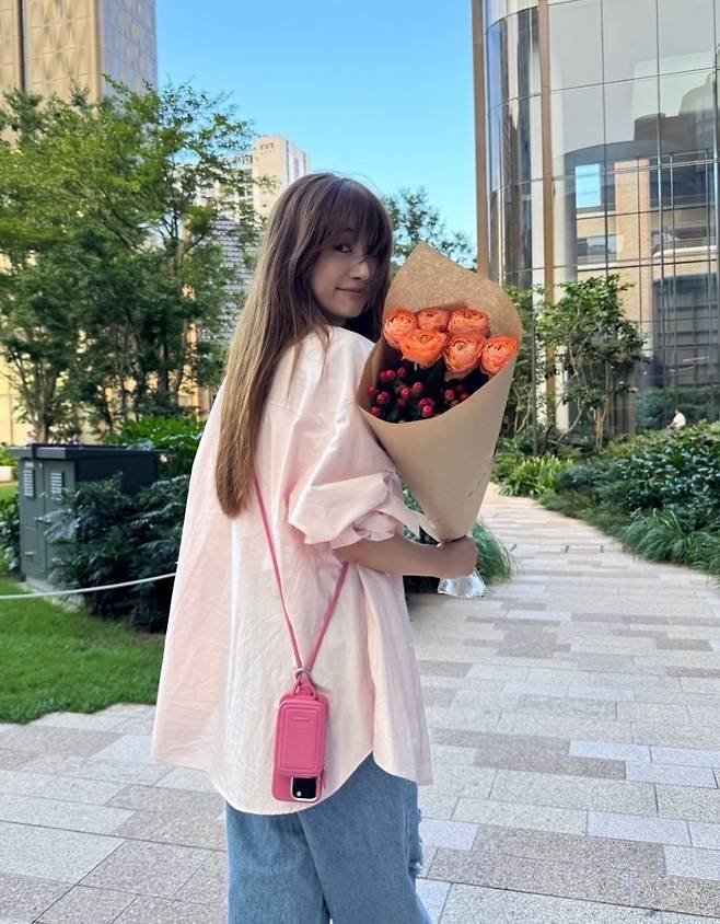 핑크 스트랩 케이스로 연결된 미니백은 소녀 같은 무드를 더했고요.