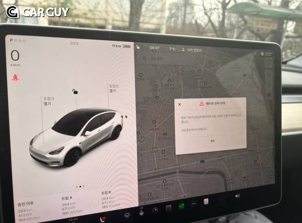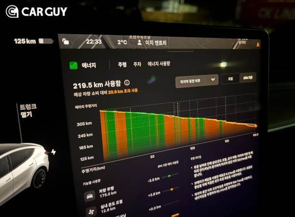 먼저 서울에서의 일정을 모델Y와 함께 했다. 강남을 출발해 성수, 이촌을 오가며 약 30km가량을 주행했지만 감소폭은 표기된 주행거리와 큰 차이를 보이지 않았다. 일정을 마치고 경기도 용인 에버랜드 방향으로 향했다.