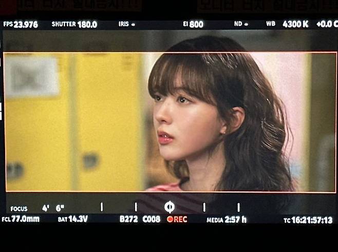 특히 이 장면은 카메라 모니터 속에서 캡처된 컷으로, 촬영 중의 긴장감과 몰입도를 고스란히 담아낸다. 흐릿한 배경 속에서 도드라지는 노정의의 페이스라인과 자연스럽게 흘러내린 시스루 뱅은 감정을 더욱 풍부하게 전달하며 보는 이로 하여금 눈을 뗄 수 없게 만든다.