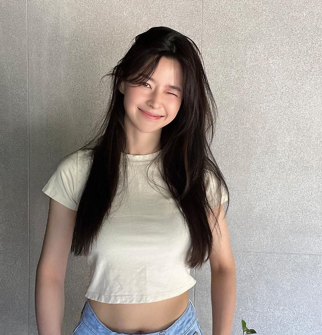 권나라는 기장이 짧은 크롭 티셔츠로 기본이 되는 내추럴룩을 완성했습니다.