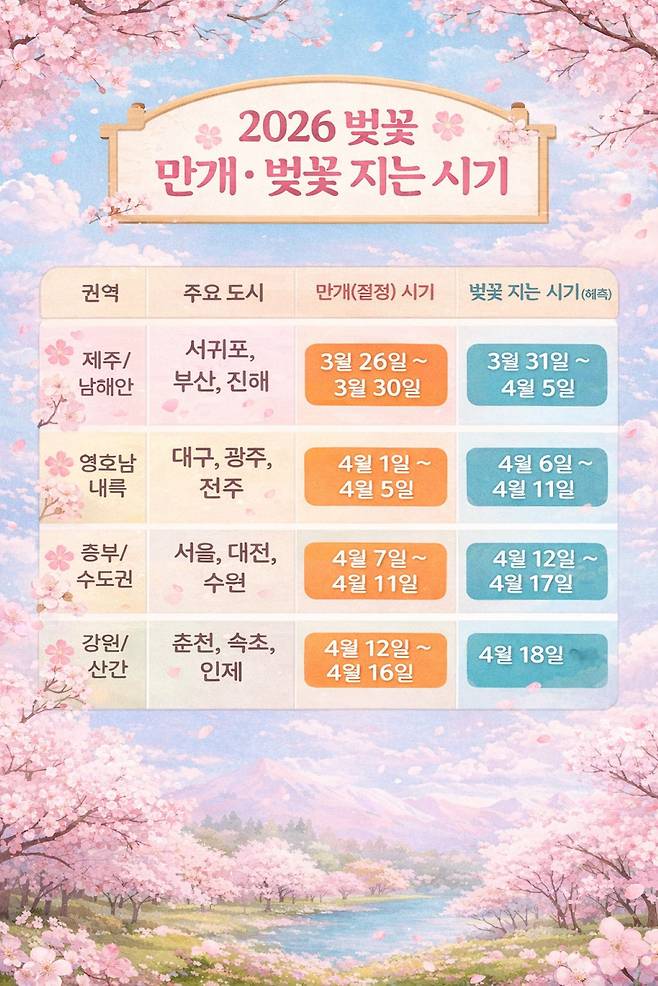 그렇다면 올해 전국의 벚꽃 지는 시기는 구체적으로 언제쯤일까요? 벚꽃은 보통 만개 후 일주일 정도가 지나면 본격적으로 낙화를 시작합니다. 2026년 기상 전망을 바탕으로 예측한 권역별 엔딩 스케줄은 다음과 같습니다.