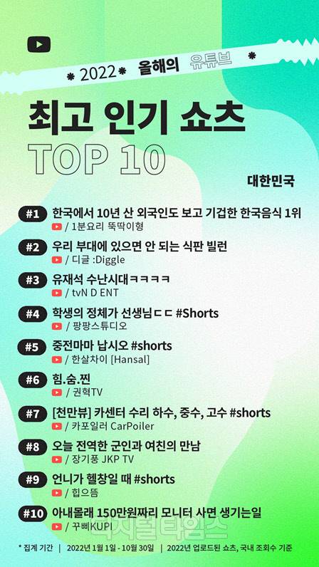 한편 유튜브는 올해 업로드된 쇼츠 중 1월1일부터 10월30일까지 국내 조회 수를 기준으로 해당 순위를 집계했다고 밝혔다.