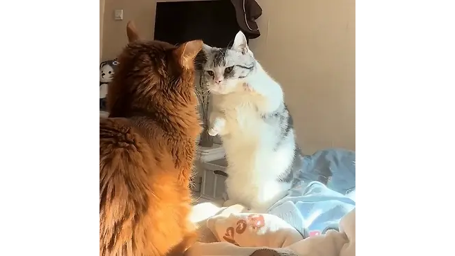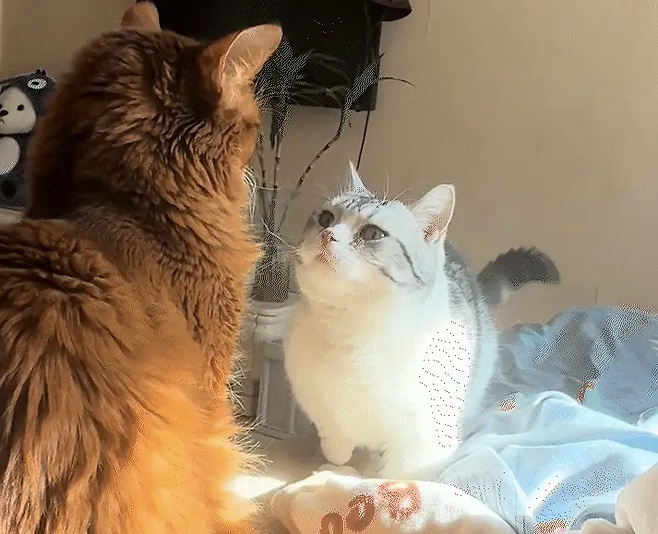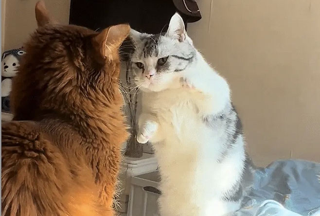 반면 다른 고양이는 순간을 놓치지 않고 재빠르게 움직여 다리 짧은 고양이의 머리를 확 때렸습니다! 예상치 못한 공격에 아기 고양이는 당황하며 기세가 순식간에 꺾여 구석으로 살금살금 숨어버렸습니다.