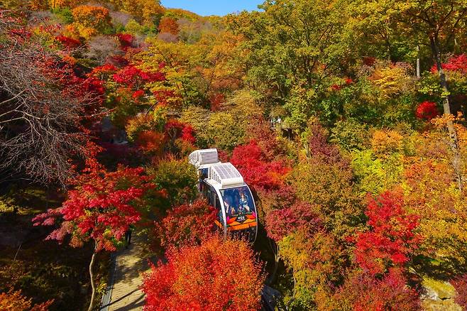 새벽녘처럼 고요한 단풍 사이로 천천히 길을 나아가는 케이블카는 놓치지 말고 꼭 타보시길 바라요.