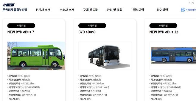 GS그룹의 GS글로벌이 수입, 판매하는 BYD의 41인승 e버스-9은 2,310만 원, 60인승 e버스-12는 2,180만원, 23인승 뉴 BYD e버스-7는 1,007만 원이다. 이들 차량 모두 BYD의 LFP 배터리가 장착됐다.