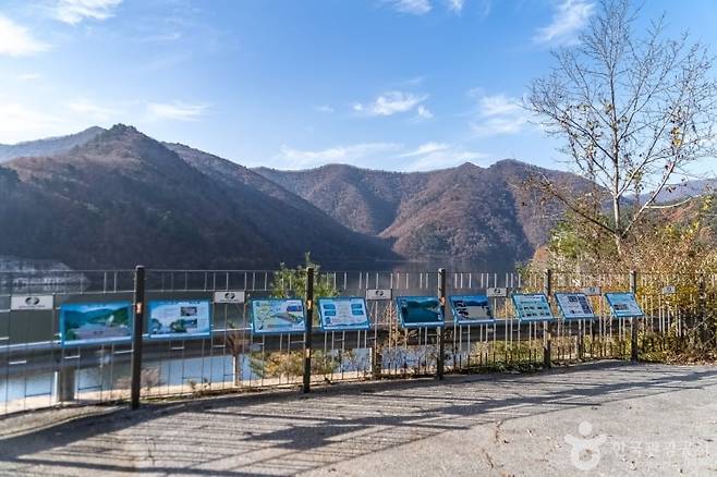 도암호를 가장 아름답게 감상할 수 있는 단아한 정자와 우뚝 서 있는 표지석이 도암호의 운치를 더합니다.