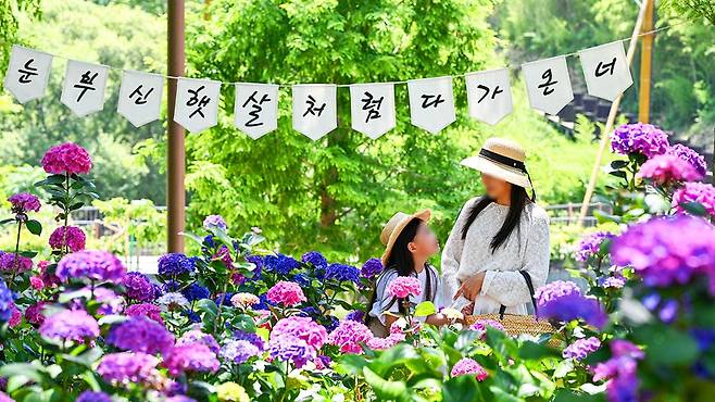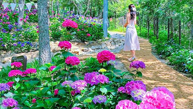 오솔길을 따라 걷다 보면 목수국, 아나벨, 썸머러브, 차수국 등 다양한 품종의 수국이 흐드러지게 피어 있어 마치 동화 속 숲길을 걷는 듯한 착각을 일으킵니다.