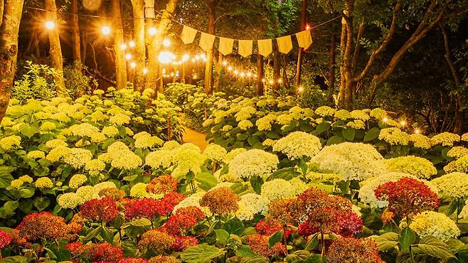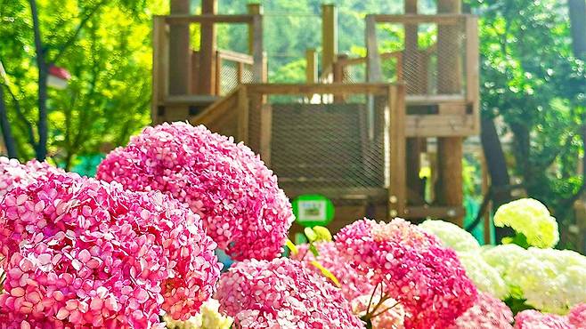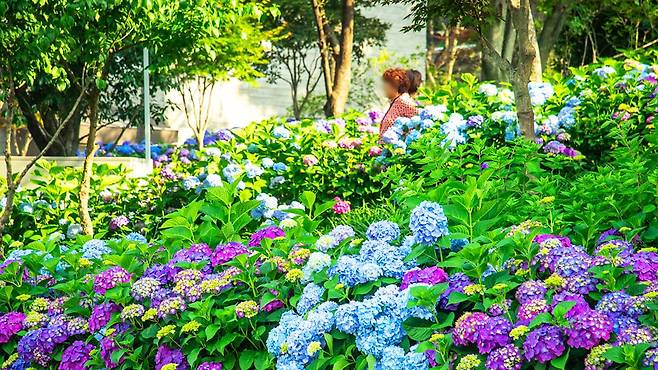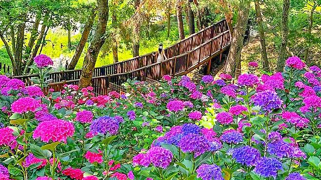 하지만 6월 중순, 풍경은 완전히 달라집니다. 바로 수국이 만개하며 숲 전체가 화사하게 물들기 때문이죠.