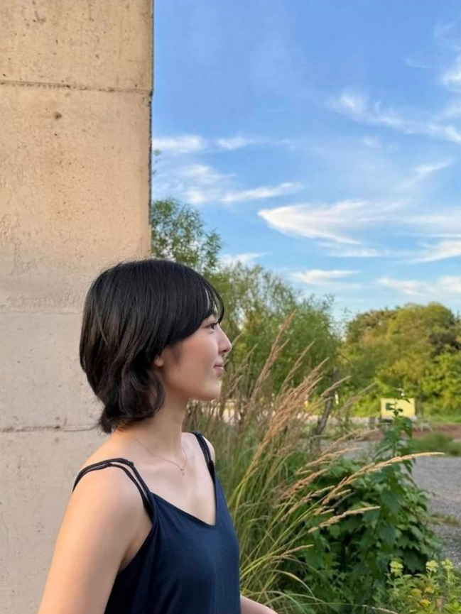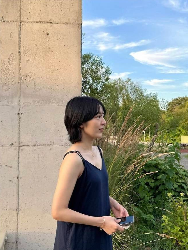 얇은 어깨 끈과 가벼운 리넨 텍스처가 더위 속에서도 시원하고 정제된 분위기를 풍기며, 무심하게 내려앉은 머리카락과 단정한 단발 헤어가 전체적인 룩을 더욱 깔끔하게 완성했습니다.