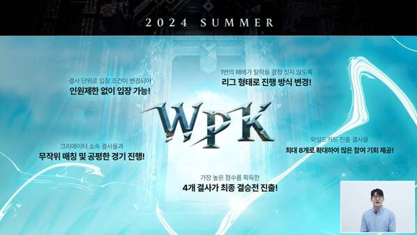 서버 간 치열한 전투를 펼치는 '2024 WPK SUMMER'가 개최된다. 이번 서머는 스프링과 달리 결사 간의 리그전이 콘셉트다. 결사 단위로 즐길 수 있는 만큼 입장 조건을 완화해 인원 제한 없이 입장 가능하도록 변경했다.