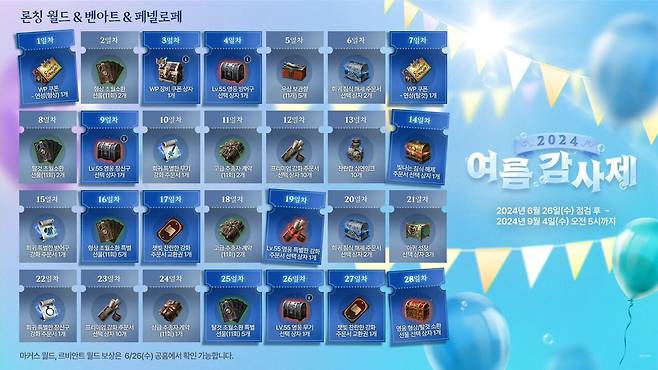 여름맞이 신규 이벤트 2종을 실시한다. 이벤트 기간 내에 28일 동안 접속하면 각종 보상을 지급하는 '여름 감사제'가 진행된다. 재합성 도전의 기회를 제공하는 WP 쿠폰부터 영웅 장비, 주문서, 초월 소환권 등 스펙 상승에 도움을 주는 보상이 준비돼 있다.