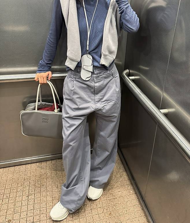 톤온톤으로 매치한 차분한 블루 계열의 긴팔 티셔츠와 와이드 팬츠, 여기에 무심하게 회색 맨투맨을 어깨에 걸쳐 레이어드 감성을 더했습니다.