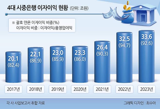 전체 순이익 중 이자이익 비중도 나날이 높아졌다. 지난 2015년 기준 4대 은행의 총 영업이익(20조8414억원) 중 이자이익(18조582억원) 비중은 81.7% 수준이었다. 하지만 2023년 기준 총 영업이익(36조3040억원) 중 이자이익(33조6264억원) 비중은 92.6%로 10%포인트 이상 늘었다. 기준금리가 가파르게 오른 지난 2022년에는 이자이익 비중이 94.7%까지 치솟았다.