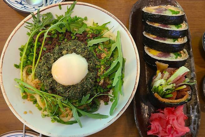 내부는 깔끔한 원목 인테리어로 아늑하고 세련된 분위기를 자아냅니다. 료미의 대표 메뉴는 덮밥, 소바, 그리고 우리나라 김밥과 닮은 후토마키인데요. 덮밥 중에서는 부드러운 소고기 토시살이 올라간 스테이크 덮밥이 인기입니다.