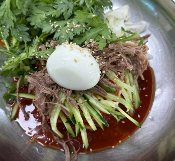 고명: 아삭한 채소와 고기 고명, 물밀면에는 얼음을 동동 띄워 시원함을 더합니다. 🥒