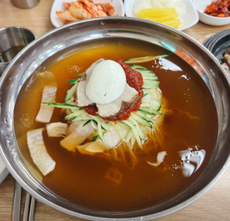 물밀면: 겨자와 식초를 취향껏 넣어 먹으면 맛이 배가됩니다. 🌊