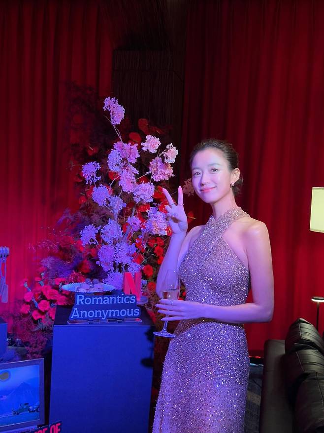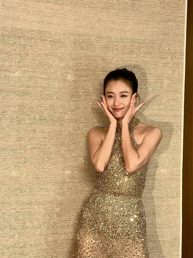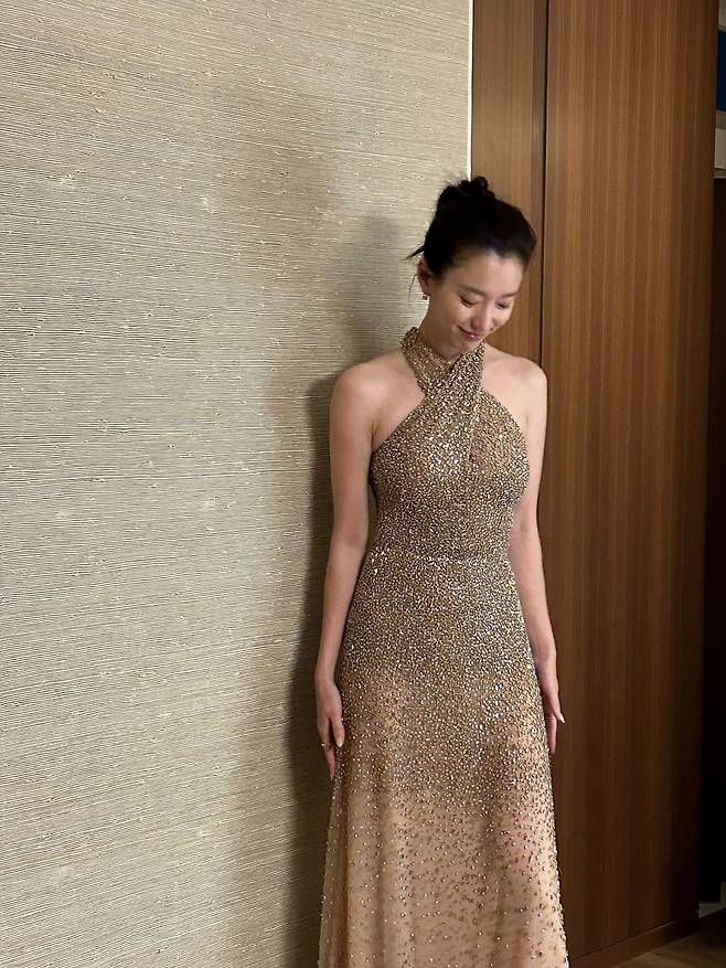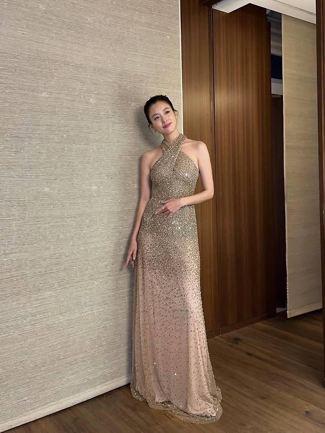 사진 속 한효주는 온몸을 감싸는 금빛 홀터넥 드레스를 입고 우아한 매력을 발산하고 있습니다.