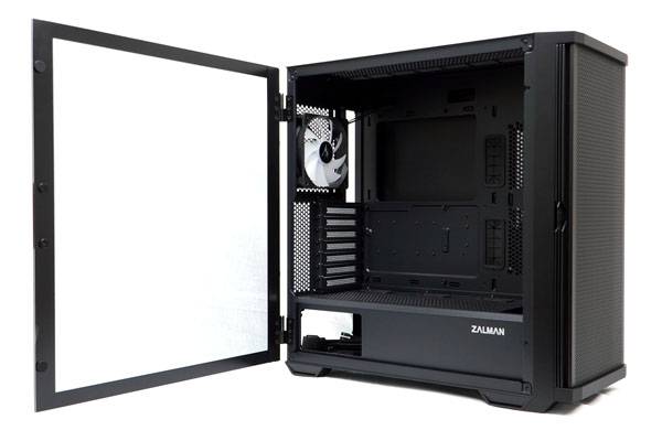 잘만 Z10 플러스 개선판(KOR)의 가장 큰 특징은 강화유리 사이드 패널이 장착되는 방식이다. 기존 모델은 반대쪽 패널과 마찬가지로 나사를 사용해 완전히 고정시키는 방법을 썼는데, 개선판은 고강도 힌지 타입 강화유리 패널을 통해 손잡이를 잡고 창문이나 장식장처럼 쉽게 열고 닫을 수 있다.