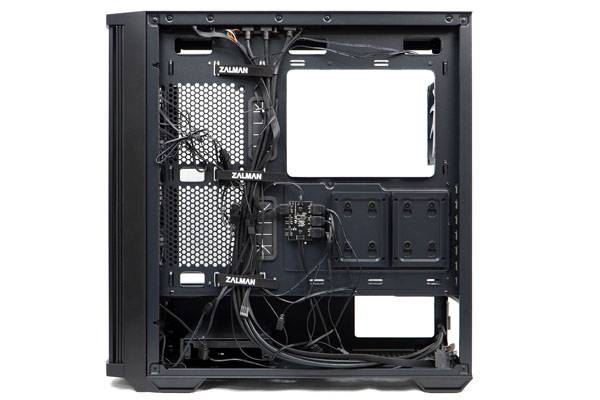 케이스 내부 구조는 기존 Z10 플러스와 동일하다. Mini-ITX부터 mATX, ATX, E-ATX까지 다양한 규격의 메인보드를 지원한다. 선정리를 위한 공간도 적재적소에 배치하고 고품질 고무 커버를 써서 훨씬 깔끔한 모습을 보여주지만 폭 275mm 이상의 일부 E-ATX 메인보드는 케이스에 장착하면 우측 선정리홀을 막아버리기 때문에 ATX급 이하의 메인보드를 권장한다.
