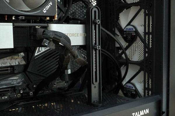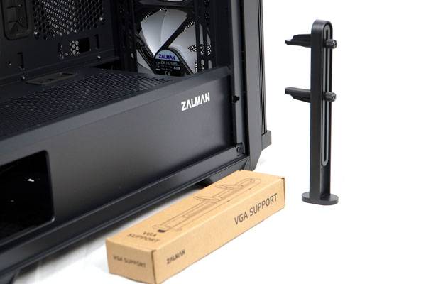 잘만 Z10 플러스는 최대 395mm 길이의 그래픽 카드를 장착할 수 있으며 그래픽 카드가 휘어지지 않게 하는 그래픽 지지대(ZM-VS1)이 기본 제공된다. ZM-VS1은 상하 슬라이드 홀더 방식으로 그래픽 카드 높이나 두께에 상관없이 정확한 위치에 고정할 수 있으며, 받침대에 자석이 있어 케이스 어느 쪽에 놓더라도 바닥에 잘 붙는다. 물론 더 안전하게 쓸 수 있도록 나사로 바닥에 고정시키는 것도 가능하다.