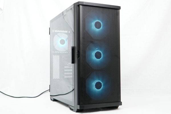 케이스 전면에는 ARGB 조명 기능이 들어간 3개의 140mm 쿨링팬이 기본 탑재되었으며 쿨링에 최적화된 전면 철망 메쉬 커버에 안쪽으로는 손으로 쉽게 뺄 수 있는 슬라이드 필터를 적용했다.