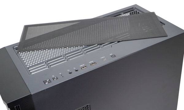 케이스 전면이 풀 사이즈 메쉬 베젤 디자인을 적용했기 때문에 케이스 버튼 및 입출력 포트는 모두 상단에 배치했다. 좌측부터 전원 버튼, 리셋 버튼, 전원 및 HDD 동작 LED, 3.5mm 헤드폰 및 마이크 단자, USB 3.0 Type-A 포트 2개, USB 3.1 Type-C 포트 1개, 그리고 ARGB 쿨링팬의 조명 색상 및 효과를 변경할 수 있는 LED 버튼이 보인다.