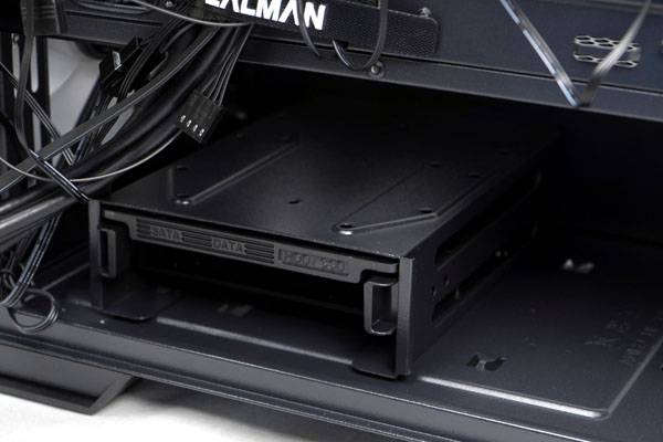 케이스 하단에는 3.5인치 HDD 장착용 드라이브 베이가 보이는데, 내부 트레이에 슬라이드 방식으로 1개를 설치하고 필요하다면 베이 상단에 나사로 고정시켜 최대 2개까지 장착할 수 있다. 파워 서플라이(PSU)는 최대 200mm 길이까지 설치 가능하다.
