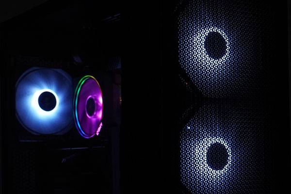 케이스 상단 I/O에 위치한 LED 버튼을 이용해 케이스 전면 3개의 140mm 쿨링팬과 후면 120mm 쿨링팬의 ARGB LED를 제어할 수 있다. LED 버튼을 누를 때마다 컬러와 패턴이 변경된다.