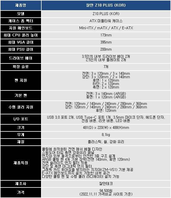 잘만 Z10 플러스는 전통적인 ATX 미들타워 케이스로 480(D) x 220(W) x 488(H)mm 크기에 무게는 8.1kg이다. 후면에는 120mm ARGB 쿨링팬이 기본 장착되어 있으며, ATX 파워를 지원한다.