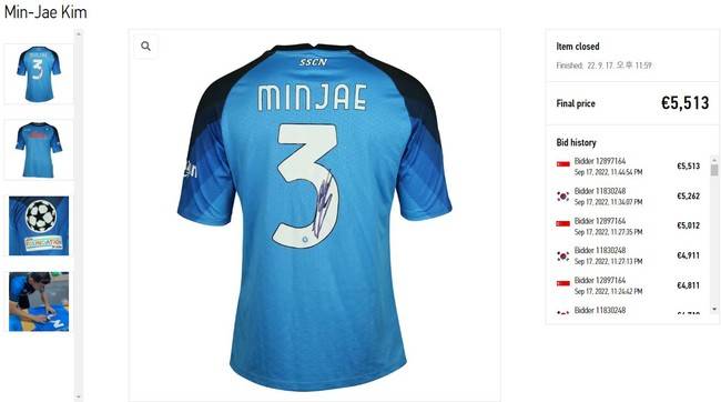 그렇다면 김민재 실착 유니폼의 가격은 어느 정도 될까. 유니폼 경매 사이트 '매치 원 셔츠'에 따르면 지난 리버풀전 김민재 유니폼은 무려 5,513 유로(약 765만 원)에 거래됐다. 시메오네(2,100 유로, 약 292만 원), 크바라츠헬리아(1,821 유로, 약 253만 원), 피오트르 지엘린스키(1,506 유로, 약 209만 원)보다 압도적인 가격으로 나폴리 선수들 가운데 1등이다. 해당 유니폼은 싱가폴 축구 팬에게 낙찰된 것으로 알려졌다.