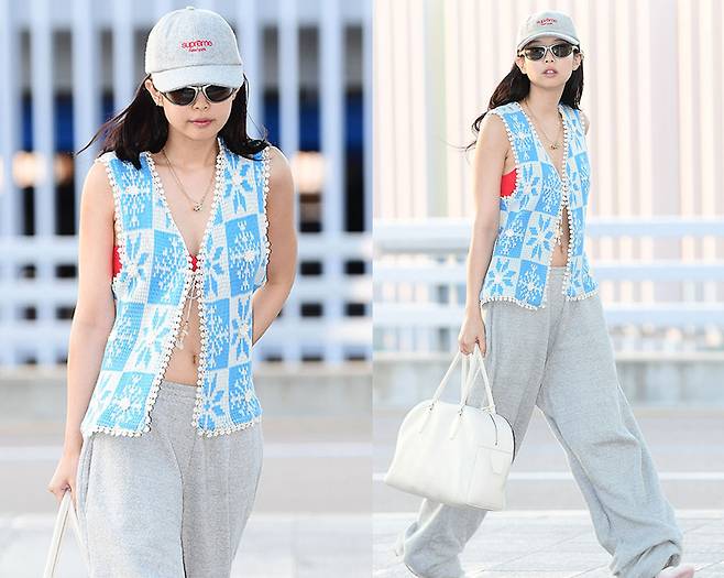 제니는 민트빛 스노우플레이크 패턴이 돋보이는 니트 베스트의 단추 하나만 채워 배를 살짝 드러낸 유니크한 연출을 선보였고, 안쪽에 살짝 보이는 레드 브라톱이 강렬한 색감 대비를 줬습니다.