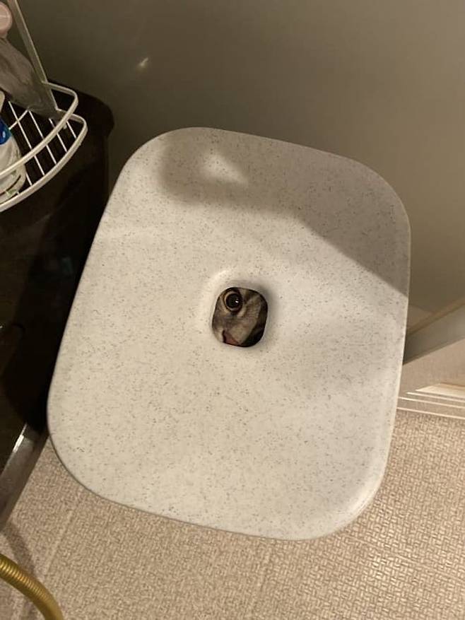 공개된 사진 속에는 고양이가 목욕 의자 아래로 들어가서는 가운데 구멍을 통해서 집사를 빤히 바라보고 있는 모습이 담겨 있었는데요.