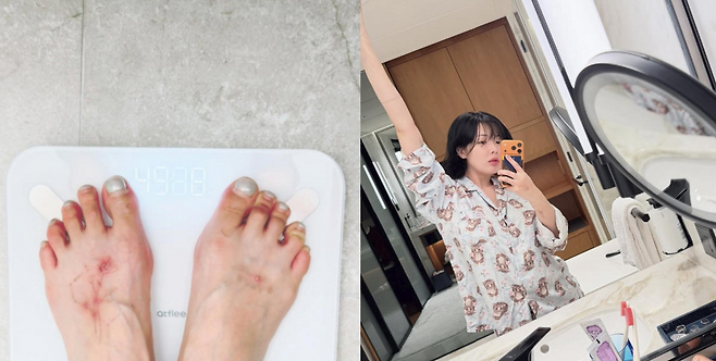 현아는 9일, 자신의 소셜 미디어를 통해 파자마 차림의 거울 셀카를 공개했습니다. 군살 하나 없는 매끈한 팔뚝은 그녀의 독한 다이어트가 성공했음을 증명했습니다. 앞서 4일에는 49.88kg이 찍힌 체중계 사진을 인증하며 팬들을 놀라게 만들었습니다. 체중계 위 그녀의 발은 상처투성이여서 그간의 노력을 짐작게 했습니다.