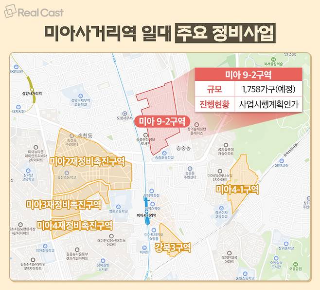 사업은 규모가 상당한 만큼 큰 기대를 받고 있습니다. 북서울꿈의숲에 이웃해 있으며, 4호선 미아사거리역에 인접해 있습니다. 동쪽으로는 9-1구역 재건축 사업이 완료되었고, 삼양입구사거리 반대편으로는 미아뉴타운 2~4구역 사업이 추진되고 있어 일대의 변모도 기대할만합니다.