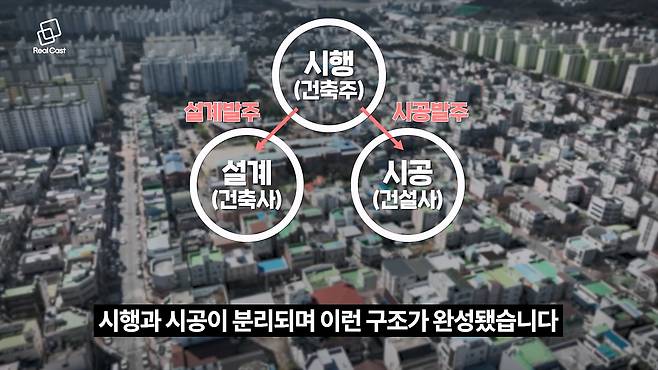 이걸 이해하려면 건설사업 구조부터 알아야죠. 우리나라에서 건물 하나를 지을 땐 시행사(건축주), 설계자, 시공사가 필요합니다. 시행사는 땅을 사서 건물을 짓는 회사고요. 설계자는 목표에 맞춰 건물을 설계하고, 시공사가 설계에 따라서 건물을 짓게 됩니다.