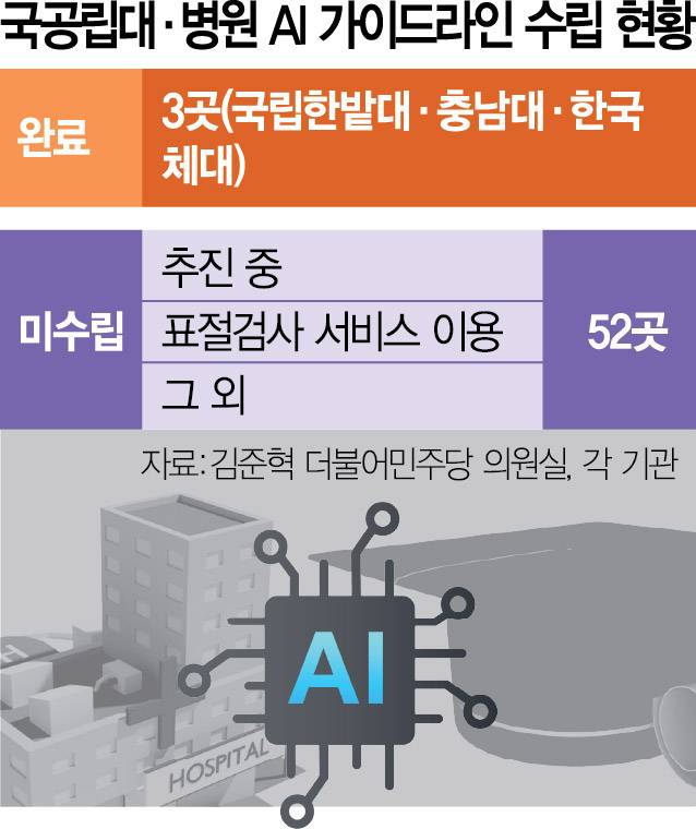 16일 국회 교육위원회 소속 김준혁 더불어민주당 의원실이 각 기관으로부터 제출받은 자료에 따르면 국공립대, 국립대 병원 55곳 중 AI 연구 활용 가이드라인을 수립한 곳은 국립한밭대·충남대·한국체육대 등 3곳에 그쳤다. 서울대 또한 “AI 윤리 가이드라인 마련을 위한 태스크포스(TF)를 운영 중”이라면서도 아직 가이드라인은 만들지 않은 상황이다.
