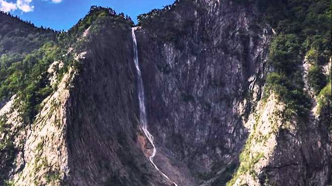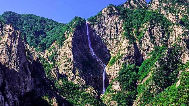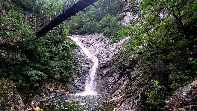총 길이 320m에 이르는 이 폭포는 국내에서 가장 긴 연속 낙차를 자랑하며, 물줄기가 절벽을 타고 흘러내리는 그 모습은 마치 선녀가 하얀 비단을 펼쳐놓은 듯한 섬세함과 장엄함을 동시에 품고 있다.