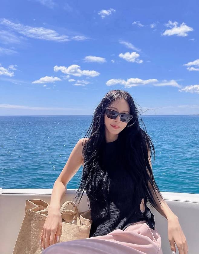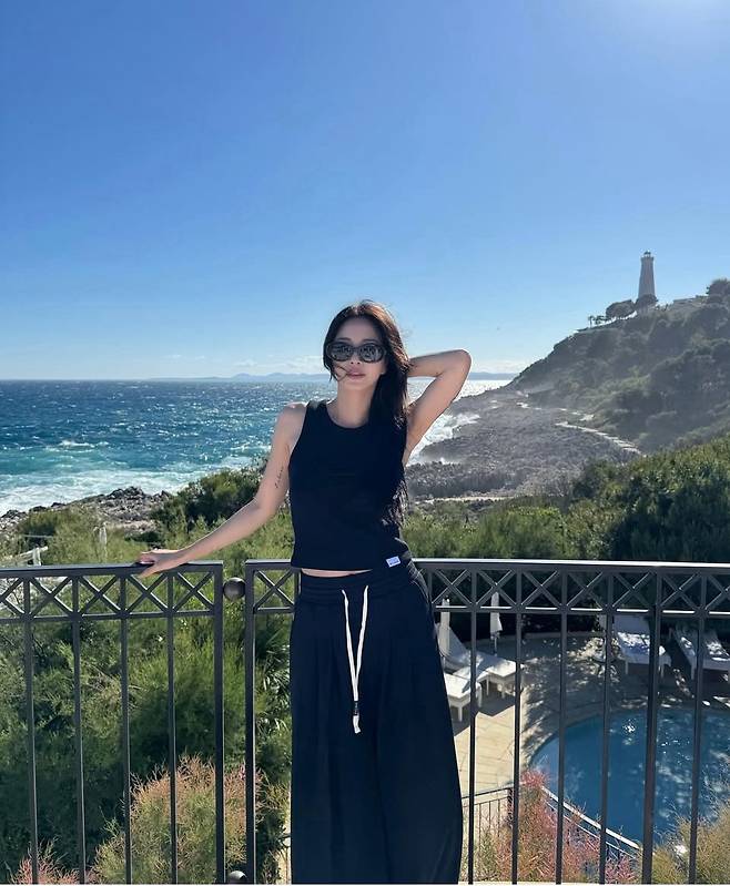 블랙 슬리브리스 상의와 핑크톤 팬츠의 조합으로 여유로운 리조트 스타일을 선보였고, 각진 선글라스를 더해 도회적인 에지를 살렸습니다.