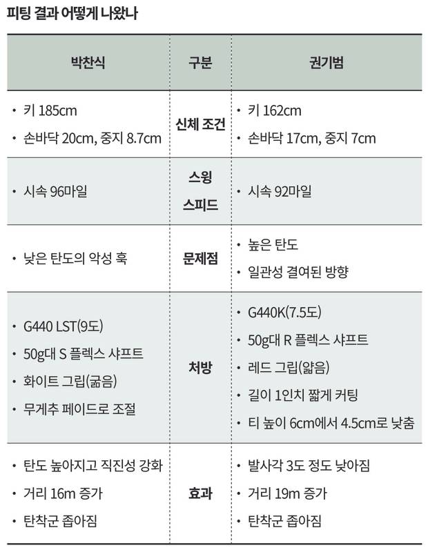 요약하면 높은 탄도와 일관성 없는 방향으로 고민이었던 권기범씨에 대해서는 관용성이 뛰어난 G440 K 모델을 사용하되 로프트 각도는 7.5도, 티 높이는 4.5cm 정도로 낮게 꽂으라는 처방이 나왔다. 아울러 그립은 얇은 레드(시중 62 사이즈), 드라이버 길이는 1인치 커팅한 45인치가 알맞은 것으로 나타났다.