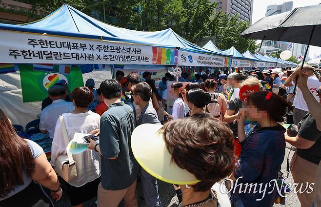 | ▲ 성소수자와 성소수자들의 인권과 권리를 지지하는 내외국인들이 참여하는 ‘피어나라 퀴어나라 - 제24회 서울퀴어문화축제’가 1일 서울 을지로 2가 일대에서 열렸다. 축제장에 외국 대사관 부스가 설치되어 있다. |