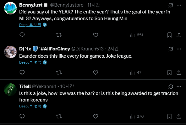 어떤 팬은 "정말 농담이다. MLS에 와주셔서 감사하다고 손흥민에게 상을 준 건가?"라고 이해할 수 없다는 반응을 보였다.