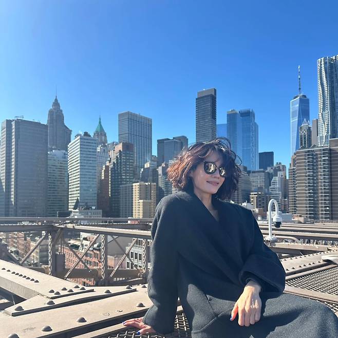 브루클린 브리지 위에서는 오버사이즈 블랙 코트와 선글라스로 도회적이고 시크한 이미지를 완성했다. 바람에 흩날리는 단발머리와 뉴욕의 스카이라인이 어우러져 자유로운 분위기를 자아낸다. 심플하지만 강렬한 블랙 스타일링이 도시적 매력을 극대화한다