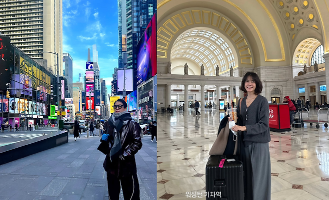 워싱턴 기차역에서는 그레이 컬러의 니트와 와이드 팬츠로 편안하면서도 단정한 여행자 스타일을 선보였다. 블랙 캐리어와 베이지 코트, 음료를 들고 있는 모습에서 실용성과 여유로움이 느껴진다. 자연스러운 헤어스타일과 미소가 전체 룩에 친근함을 더한다