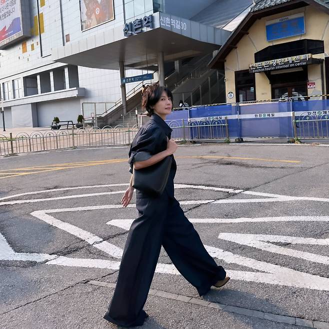 김지호는 신촌역 앞에서 올블랙 셋업으로 세련된 도시적 감각을 연출하고 있다. 여유로운 실루엣의 와이드 팬츠와 오버핏 상의가 트렌디함을 강조하며, 블랙 숄더백으로 실용성과 스타일을 모두 잡았다. 전체적으로 미니멀하면서도 시크한 분위기가 돋보인다