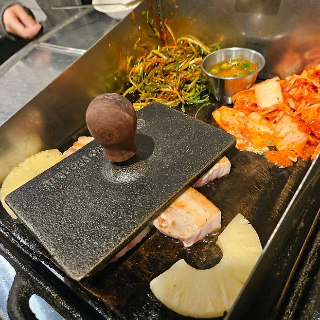 숙성고기 전문점 '다리미 삼겹살'에서는 특수 제작한 철판 다리미로 고기를 직접 구워준다. 다리미 덕분인지 두꺼운 고기가 노릇노릇 바삭바삭하게 금방 익는다. 고기를 다 먹으면 다리미로 누른 치즈볶음밥까지 맛볼 수 있다.
