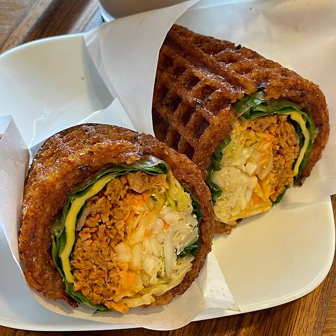 전주 벽화마을에 위치한 두이모 카페에서 판매하는 비빔밥 와플. 고추장에 버무린 흑미밥을 납작하게 구워 만든 와플에 양배추 샐러드와 제육볶음, 치즈, 깻잎을 넣고 돌돌 말아 만든 음식이다. 배를 든든하게 채울 수 있어 한끼 식사로도 훌륭하다.