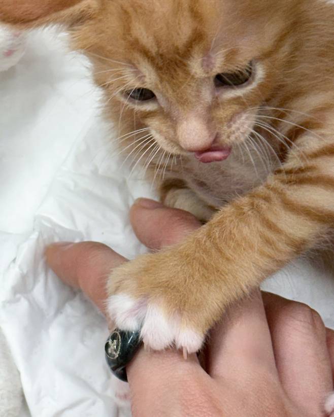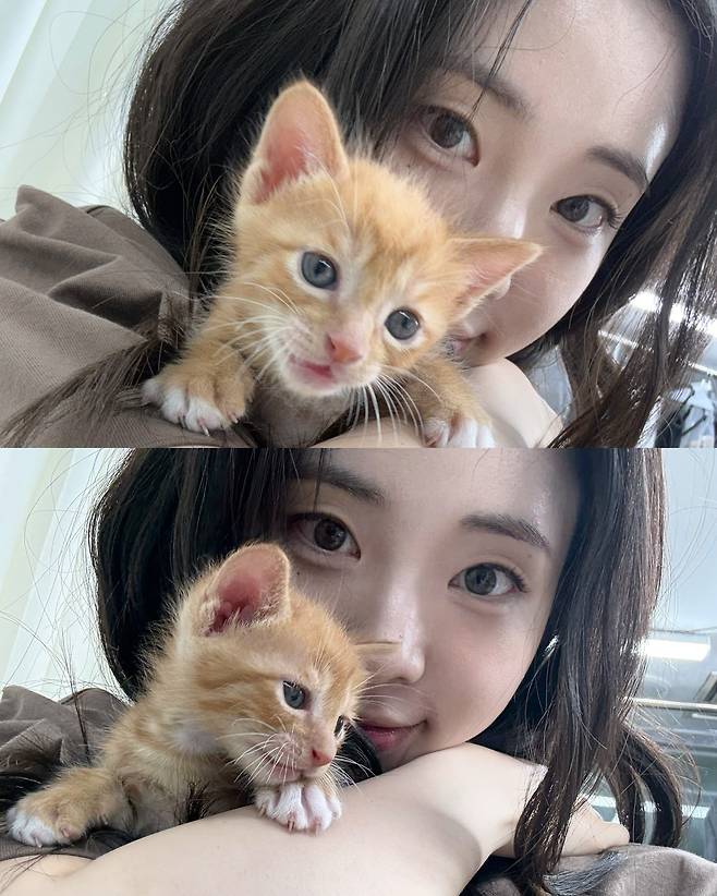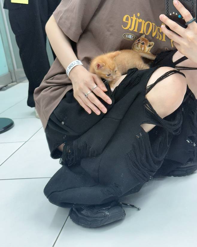 브라운빛의 고양이 프린팅 티셔츠 위로, 진짜 아기 고양이가 안겨 있어요.