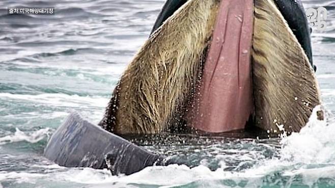 “그렇게 먹는 고래들은 대부분 수염고래예요. 수염고래들은 입안에 ‘수염판’이라고 얘기하는 촘촘한 빗살 같은 판들이 있어서 입으로 한꺼번에 머금은 물과 먹이에서 이 수염판을 통해서 물만 걸러서 뱉어냅니다. 좀 지저분하게 보일 수도 있지만 이렇게 잇새로 침 뱉는 것 같은”